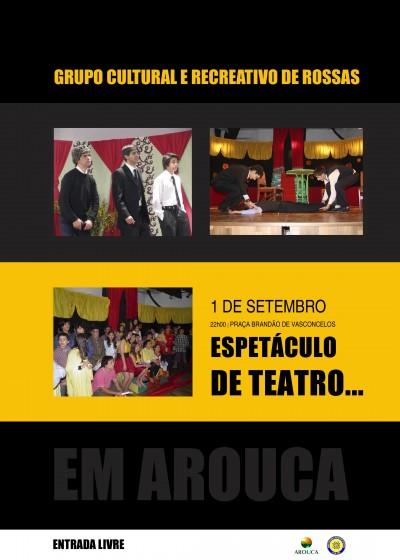 No próximo sábado, 1 de setembro, a renovada praça Brandão de Vasconcelos vai ser o cenário de uma noite de teatro, protagonizada pelo Grupo Cultural e Recreativo de Rossas (GCRR), que irá apresentar uma série de «sketches» cómicos, entre momentos musicais e variedades. Com pergaminhos na dinamização cultural e no desenvolvimento da arte do palco a que se dá o nome de Teatro, o GCRR há quase meio século que vem trilhando em Arouca, com dinamismo e assinalável êxito, o caminho do teatro amador, pensado, ensaiado e partilhado com as populações locais, a quem tem dado a conhecer peças de autores portugueses.