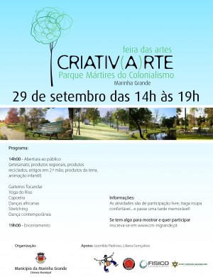 A Câmara Municipal da Marinha Grande, através da Divisão da Cultura e Turismo, vai incluir no programa das comemorações do Dia Mundial do Turismo, uma feira dedicada às artes, intitulada “CRIATIV(A)RTE”, que se realizará no dia 29 de setembro, das 14h00 às 19h00 no Parque Mártires do Colonialismo.