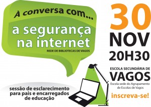 A Rede de Bibliotecas de Vagos, juntamente com a Câmara Municipal de Vagos, encontra-se a promover um ciclo de três sessões de esclarecimentos “À conversa com…”, destinado aos pais e encarregados de educação. A primeira sessão, sob o tema “A segurança na internet”, realiza-se no dia 30 de novembro, pelas 20h30, no anfiteatro da Escola Secundária de Vagos. As outras duas sessões estão agendadas para 6 de fevereiro e 12 de abril, abordando os temas “saúde e sexualidade” e “A química da Leitura”. A participação nestas sessões é gratuita, contudo é necessário efetuar uma inscrição para cada sessão. De momento, as inscrições encontram-se abertas para a primeira sessão, “A Segurança na Internet” que se realiza no dia 30 de novembro. Os tópicos abordados, nesta primeira sessão, dedicada à “Segurança na internet”, e apresentados pela Dr.ª Maria José Loureiro, do Centro de Competências TIC da Universidade de Aveiro, serão: a segurança face a infeções através de downloads; códigos de conduta online; ajuda em questões de cyberbullying .