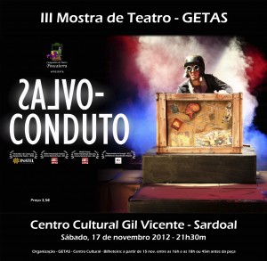 A III Mostra de Teatro, promovida pelo GETAS de Sardoal, vai ter início no Centro Cultural Gil Vicente, no sábado, 17 de novembro de 2012, pelas 21h30m, através da apresentação da peça “Salvo Conduto”, produzida pela Companhia de Teatro “Poucaterra”, do Entroncamento.