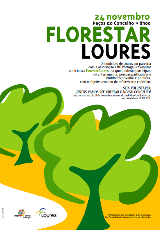 A Câmara Municipal de Loures em parceria com a Associação AMO Portugal promove, no próximo sábado, dia 24 de novembro, a iniciativa Florestar Loures. Com ponto de encontro marcado para as 8h nos Paços do Concelho, esta ação pretende congregar os esforços de particulares e entidades públicas ou privadas no sentido de promover a reflorestação do concelho de Loures.