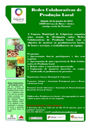 A Câmara Municipal de Felgueiras vai realizar, no próximo dia 26, pelas 15 horas, na Casa do Risco, em Airães, uma sessão de divulgação sobre as Redes Colaborativas de Produção Local, que consiste em processos de interação na produção de bens e serviços a nível da comunidade local e que colaborem entre si no aspeto da inovação, criação ou produção, vendas e comunicação. Por exemplo, um produtor de mel pode colaborar com um produtor de aguardente e criar um licor ou aguardente de mel. Ou – outro exemplo – um prestador de serviços de informática pode interagir com um técnico de contabilidade ou de designer, para melhor rentabilização e redução de custos.