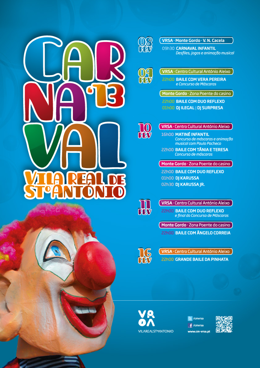 As celebrações de Carnaval no concelho de Vila Real de Santo António vão ser assinaladas com bailes e uma e uma seleção de dj´s na praia de Monte Gordo e no Centro Cultural António Aleixo, a que se juntará um programa especialmente preparado para os alunos do ensino pré-escolar e primeiro ciclo, na manhã do dia 8 de fevereiro.