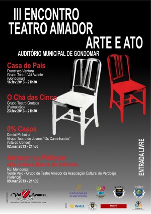 Durante os meses de fevereiro e março, as noites de sábado, no Auditório Municipal de Gondomar, estão inteiramente reservadas para a 3.ª edição do Encontro de Teatro Amador “Arte e Ato”. A iniciativa, promovida pela Associação Social e Cultural “Vai Avante”, traz até Gondomar um total de quatro grupos. Participam grupos de teatro amadores de Gondomar, Famalicão, Vila do Conde e, por último, de Valença.