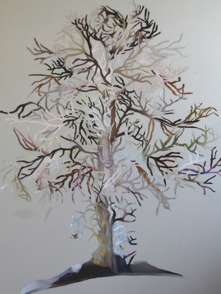 Edite Coelho define as suas peças de colagem e técnica mista que compõem a exposição “O Papel da Natureza” como uma associação de duas formas de comunicação, produzindo, assim, arte contemporânea.