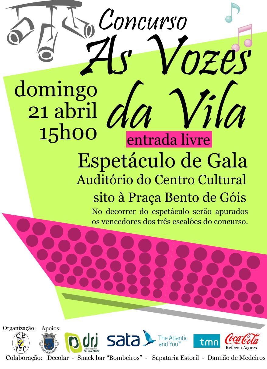 Domingo, dia 21 de abril, a partir das 15H00, o auditório do Centro Cultural de Vila Franca do Campo vai ser palco do espetáculo de Gala do Concurso “As Vozes da Vila”, promovido pelo Clube Escolar de Vila Franca do Campo com o apoio da Câmara Municipal e da Direção Regional da Juventude.