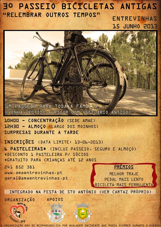 A Associação de Melhoramentos e Amigos de Entrevinhas (Sardoal) vai levar a efeito, no próximo dia 15 de junho de 2013, o “3.º Passeio de Bicicletas Antigas”, sob o lema “Relembrar outros tempos”.