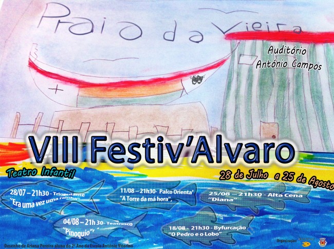 O Auditório António Campos, situado na Avenida dos Pescadores, na Praia da Vieira, acolhe até 25 de agosto, o VIII Festiv’Álvaro – Teatro Infantil, organizado pelo Teatresco – Grupo de Teatro, em colaboração com a Câmara Municipal da Marinha Grande