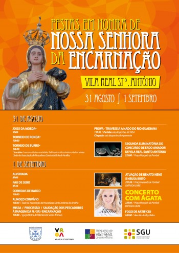As festas de Nossa Senhora da Encarnação, padroeira de Vila Real de Santo António, decorrem nos dias 31 de agosto e 1 de setembro com um concurso de fado e espetáculos musicais na Praça Marquês de Pombal.