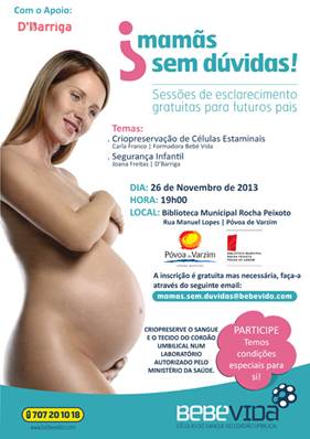Se pretende assistir gratuitamente às sessões “Mamãs Sem Dúvidas”, inscreva-se, indicando os seguintes dados: data e local da sessão; nome; localidade; data prevista para o parto e contacto telefónico. Poderá fazê-lo através dos telefones: 212 744 021/2 ou 913 322 898 ou email: mamas.sem.duvidas@bebevida.com