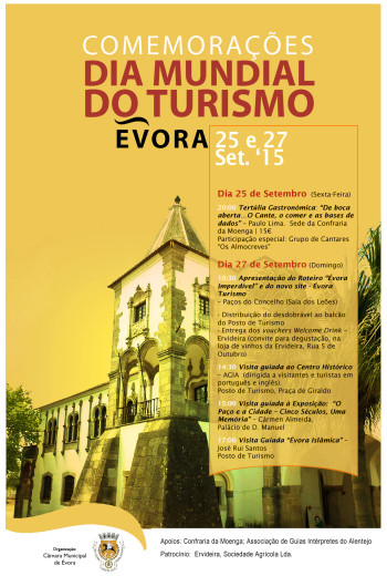 A assinalar o Dia Mundial do Turismo, que se comemora no próximo dia 27 de setembro, a Câmara Municipal de Évora vai promover um conjunto de iniciativas, das quais destacamos: o lançamento de um novo roteiro da cidade, “Évora Imperdível”, suporte de informação dirigido preferencialmente para apoio dos visitantes de curta duração, onde se destacam os mais icónicos sítios de relevo artístico/arquitetónico, paisagístico e gastronómico; a apresentação pública de um novo “sítio na Internet”, denominado “Évora Turismo”, pensado para todos os que, a partir de qualquer lugar do mundo, pretendem fazer uma visita virtual à cidade e ao concelho, antes, durante ou depois da visita presencial.