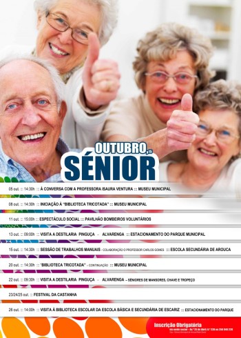 Em outubro, continuamos a promover o convívio entre os seniores arouquenses. Ao longo do mês, vamos visitar a destilaria «Pinguça» e a biblioteca escolar de Escariz, estaremos à conversa com a Prof. Isaura Ventura, teremos uma «biblioteca tricotada» e uma sessão de trabalhos manuais. O mês de outubro terá também o Festival da Castanha e o Espetáculo Social. Razões mais do que suficientes para participar nas atividades.